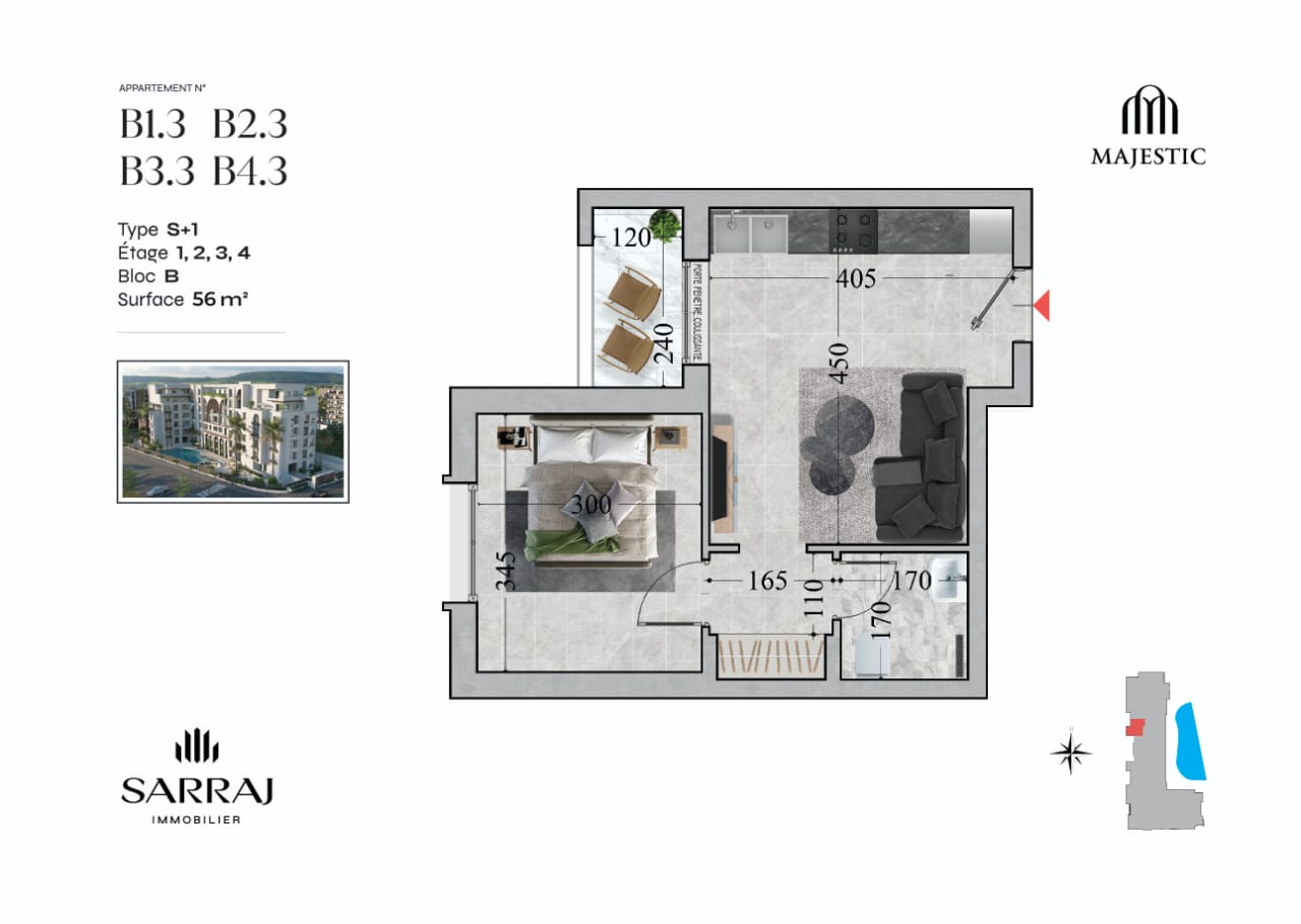 LE Majestic | 4 | B4.3 | 56 m² | Terrasse | ||
